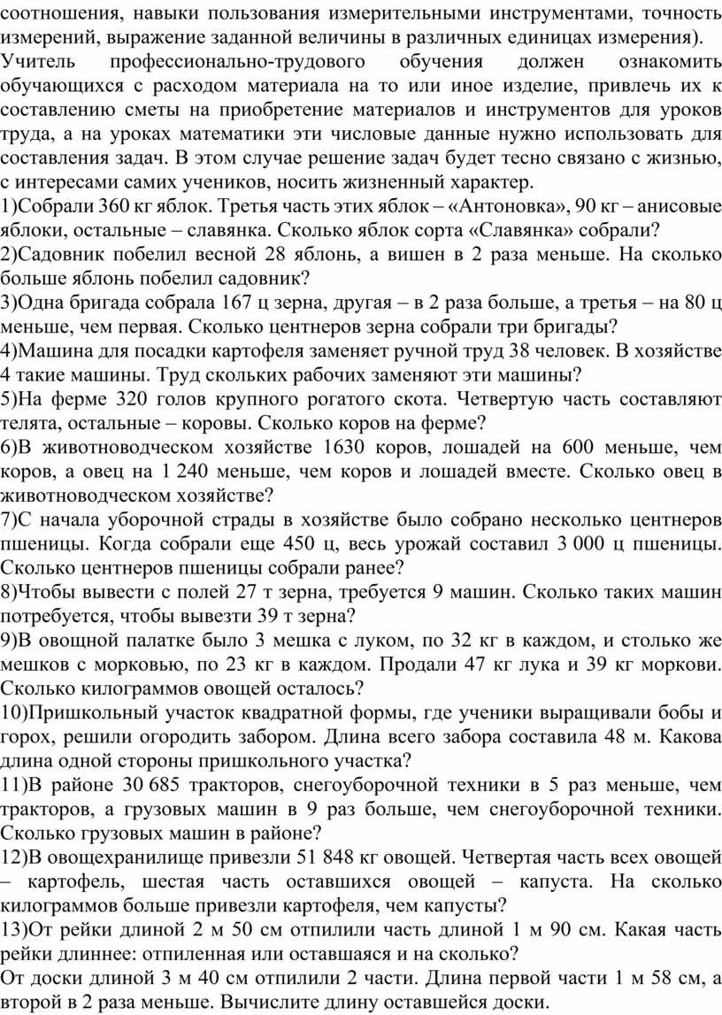 Учитель профессионально-трудового обучения должен ознакомить обучающихся с расходом материала на то или иное изделие, привлечь их к составлению сметы на приобретение материалов и инструментов для уроков труда, а на уроках математики эти числовые данные нужно использовать для составления задач. В этом случае решение задач будет тесно связано с жизнью, с интересами самих учеников, носить жизненный характер.