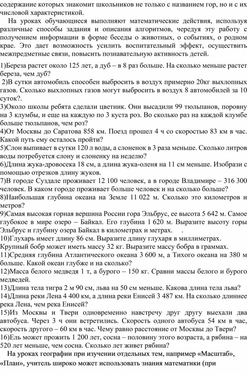 После ознакомления на уроке географии с темой «Формы поверхности Земли» на уроках математики создаются условия для составления задач, содержание которых знакомит школьников не только с названием гор, но и с их числовой характеристикой.