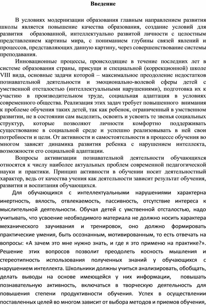 Инновационные процессы, происходящие в течение последних лет в системе образования страны, присущи и специальной (коррекционной) школе VIII вида, основные задачи которой – максимальное преодоление недостатков познавательной деятельности и эмоционально-волевой сферы детей с умственной отсталостью (интеллектуальными нарушениями), подготовка их к участию в производительном труде, социальная адаптация в условиях современного общества. Реализация этих задач требует повышенного внимания к проблеме обучения таких детей, так как ребенок, ограниченный в умственном развитии, не в состоянии сам выделить, освоить и усвоить те звенья социальных структур, которые позволяют личности комфортно поддерживать существование в социальной среде и успешно реализовывать в ней свои потребности и цели. От активности и самостоятельности в процессе обучения во многом зависят динамика развития ребенка с нарушением интеллекта, возможности его социальной адаптации.