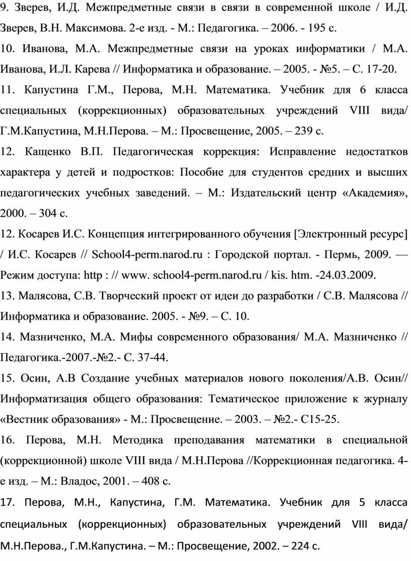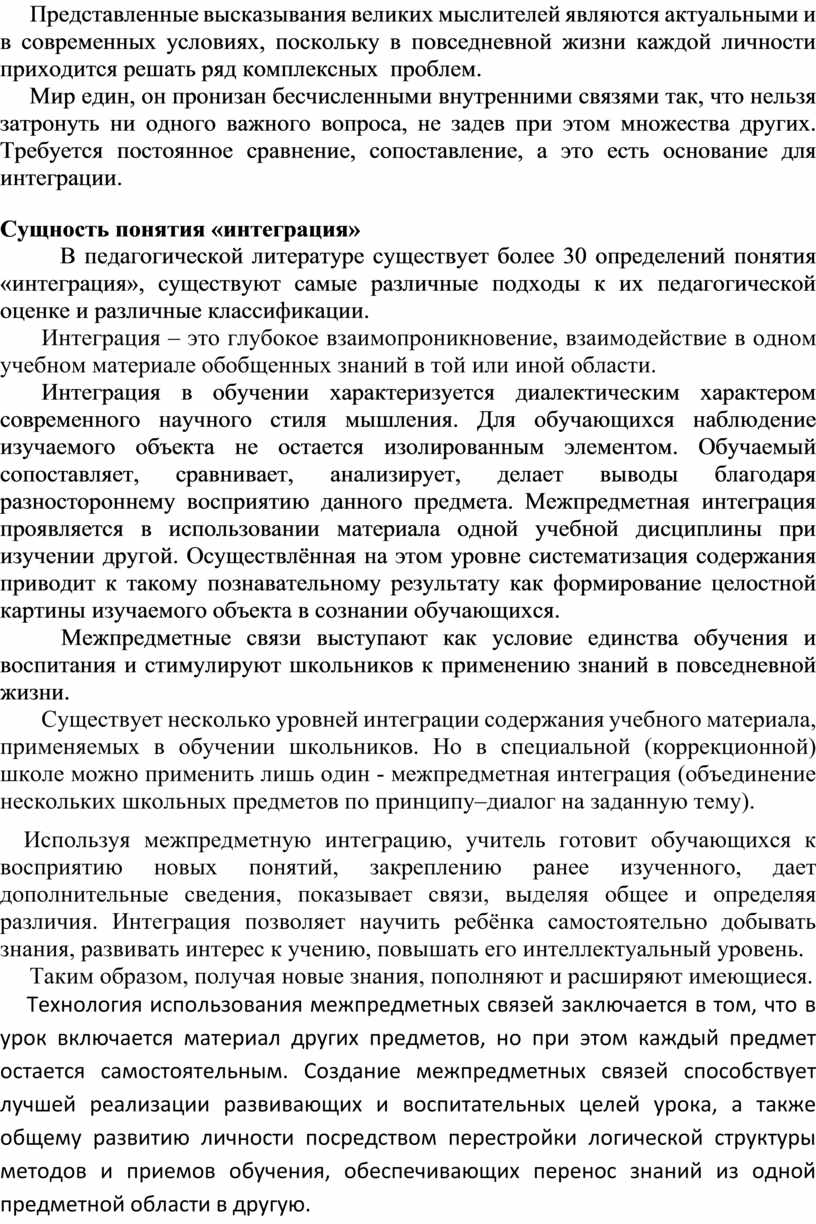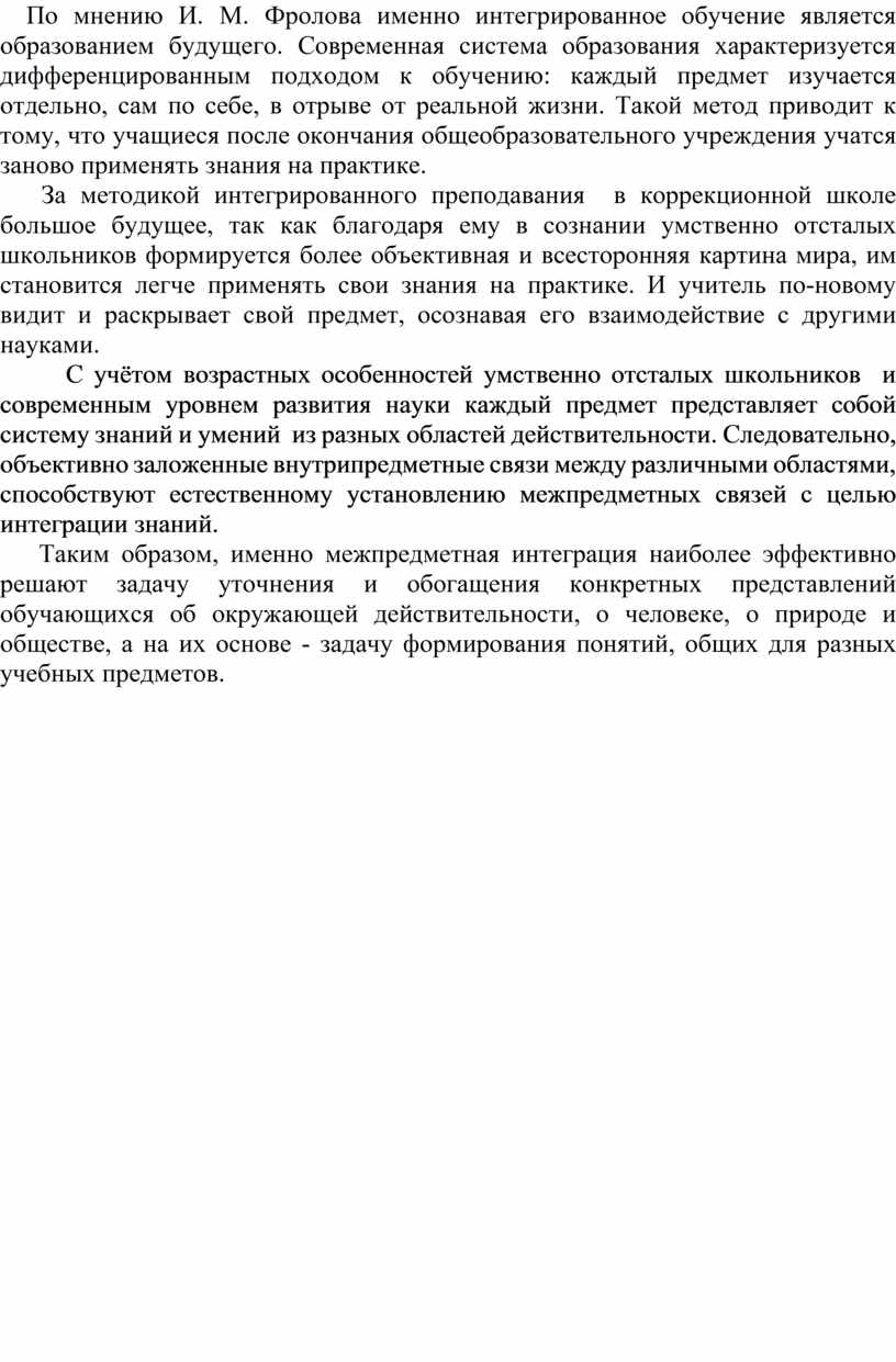 За методикой интегрированного преподавания в коррекционной школе большое будущее, так как благодаря ему в сознании умственно отсталых школьников формируется более объективная и всесторонняя картина мира, им становится легче применять свои знания на практике. И учитель по-новому видит и раскрывает свой предмет, осознавая его взаимодействие с другими науками.