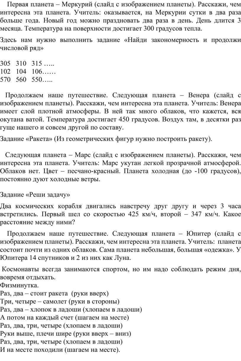 Первая планета – Меркурий (слайд с изображением планеты). Расскажи, чем интересна эта планета. Учитель: оказывается, на Меркурии сутки в два раза больше года. Новый год можно праздновать два раза в день. День длится 3 месяца. Температура на поверхности достигает 300 градусов тепла.