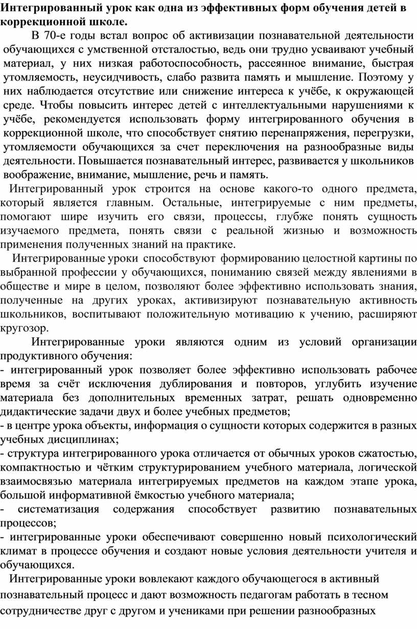 В коррекционной школе все школьные дисциплины обладают своеобразным интегрированным потенциалом.