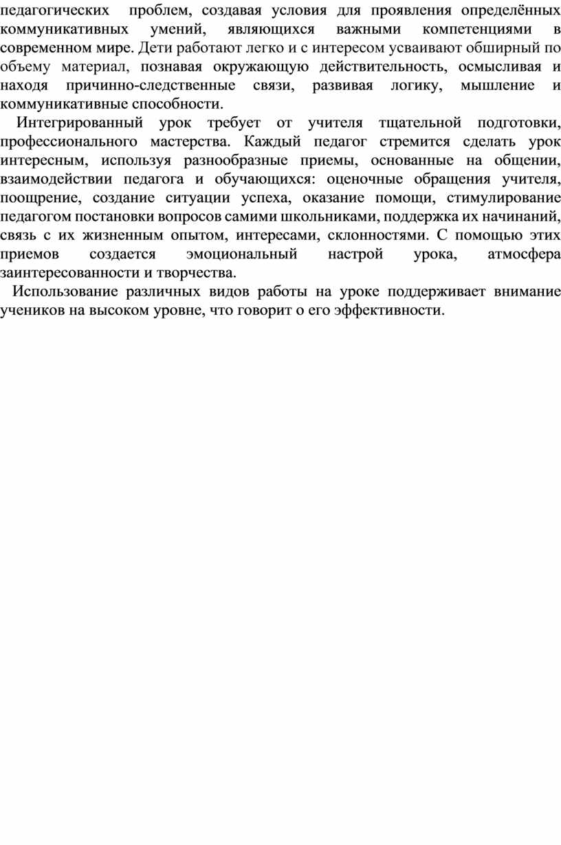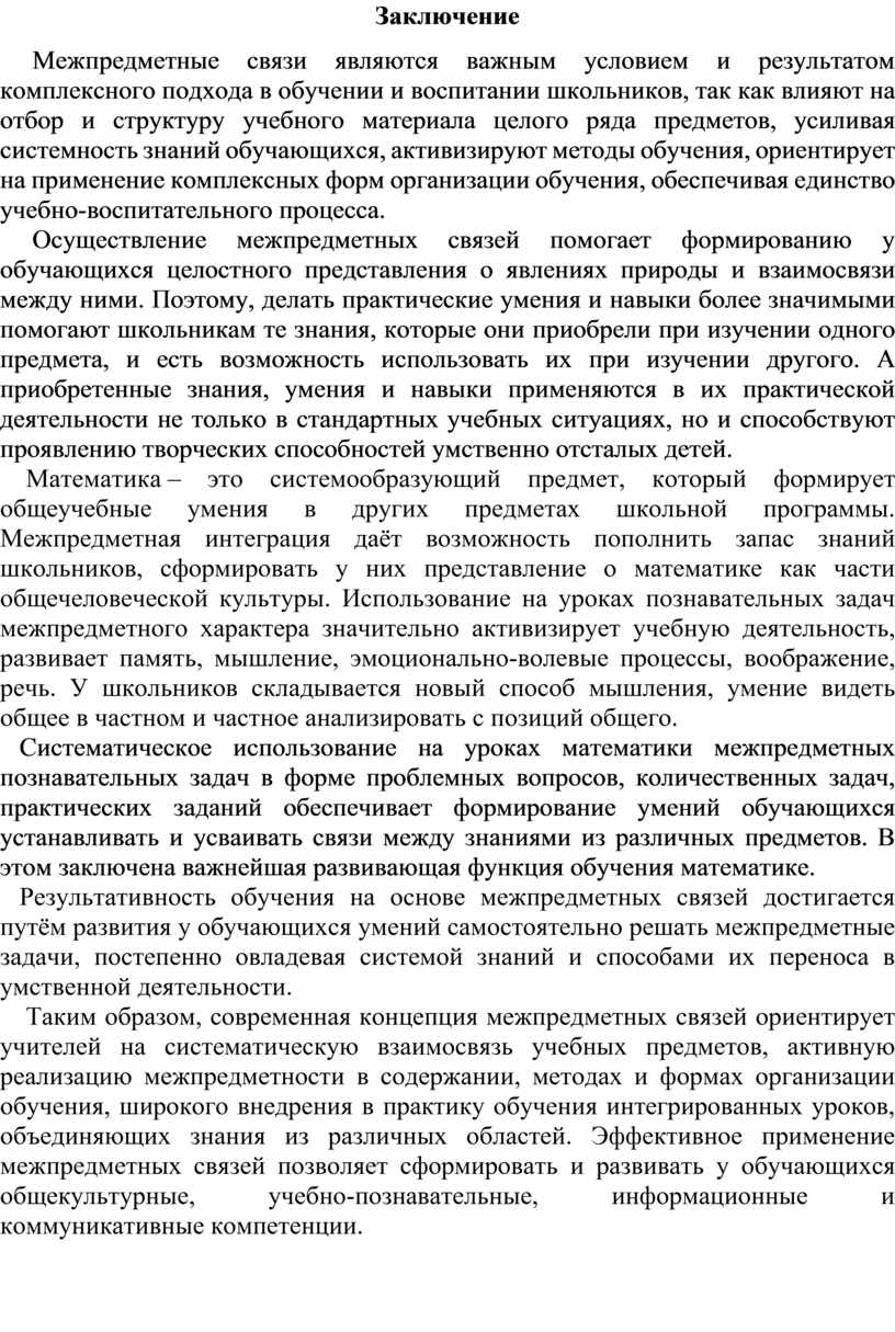 Таким образом, для продуктивного усвоения учеником знаний и для его интеллектуального развития средствами разных предметов важно установление широких связей как между разными разделами изучаемых курсов, так и между разными предметами в целом. Интеграция способствует не только систематизации, интенсификации учебно-воспитательной деятельности, но и овладению грамотой культуры человека, поэтому чрезвычайно актуальна и необходима в современной школе.