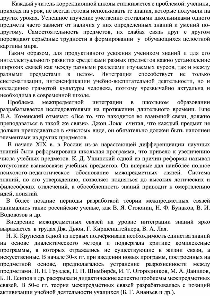 Каждый учитель коррекционной школы сталкивается с проблемой: ученики, приходя на урок, не всегда готовы использовать те знания, которые получили на других уроках. Успешное изучение умственно отсталыми школьниками одного предмета часто зависит от наличия у них определенных знаний и умений по-другому. Самостоятельность предметов, их слабая связь друг с другом порождают серьёзные трудности в формировании у обучающихся целостной картины мира.