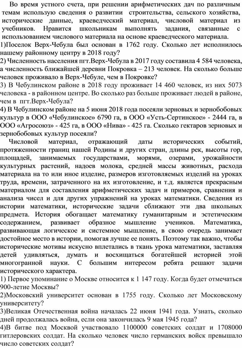 Во время устного счета, при решении арифметических дач по различным темам использую сведения о развитии строительства, сельского хозяйства, исторические данные, краеведческий материал, числовой материал из учебников. Нравится школьникам выполнять задания, связанные с использованием числового материала на основе краеведческого материала.