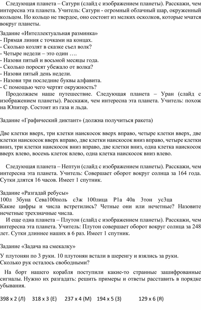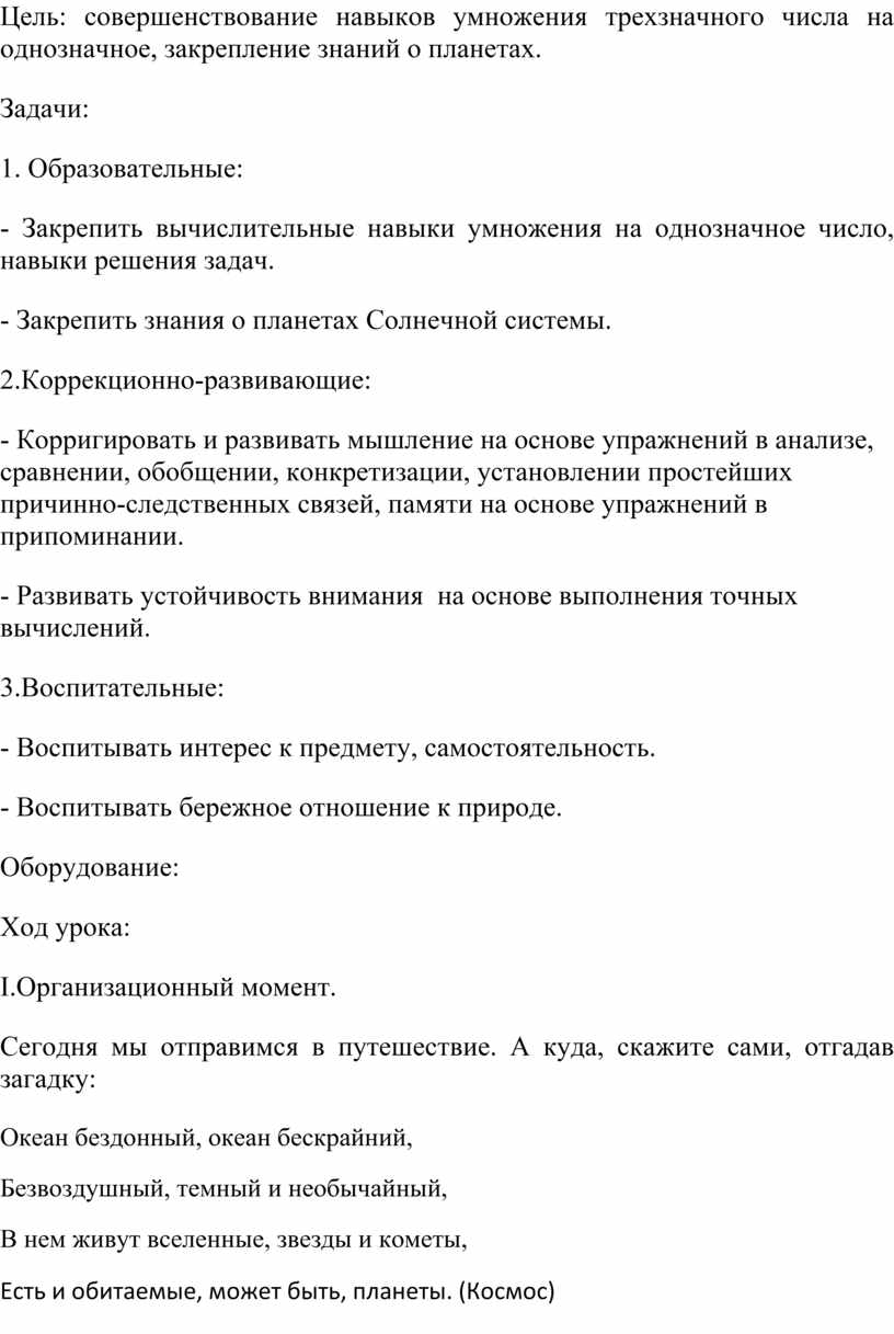 Цель: совершенствование навыков умножения трехзначного числа на однозначное, закрепление знаний о планетах.