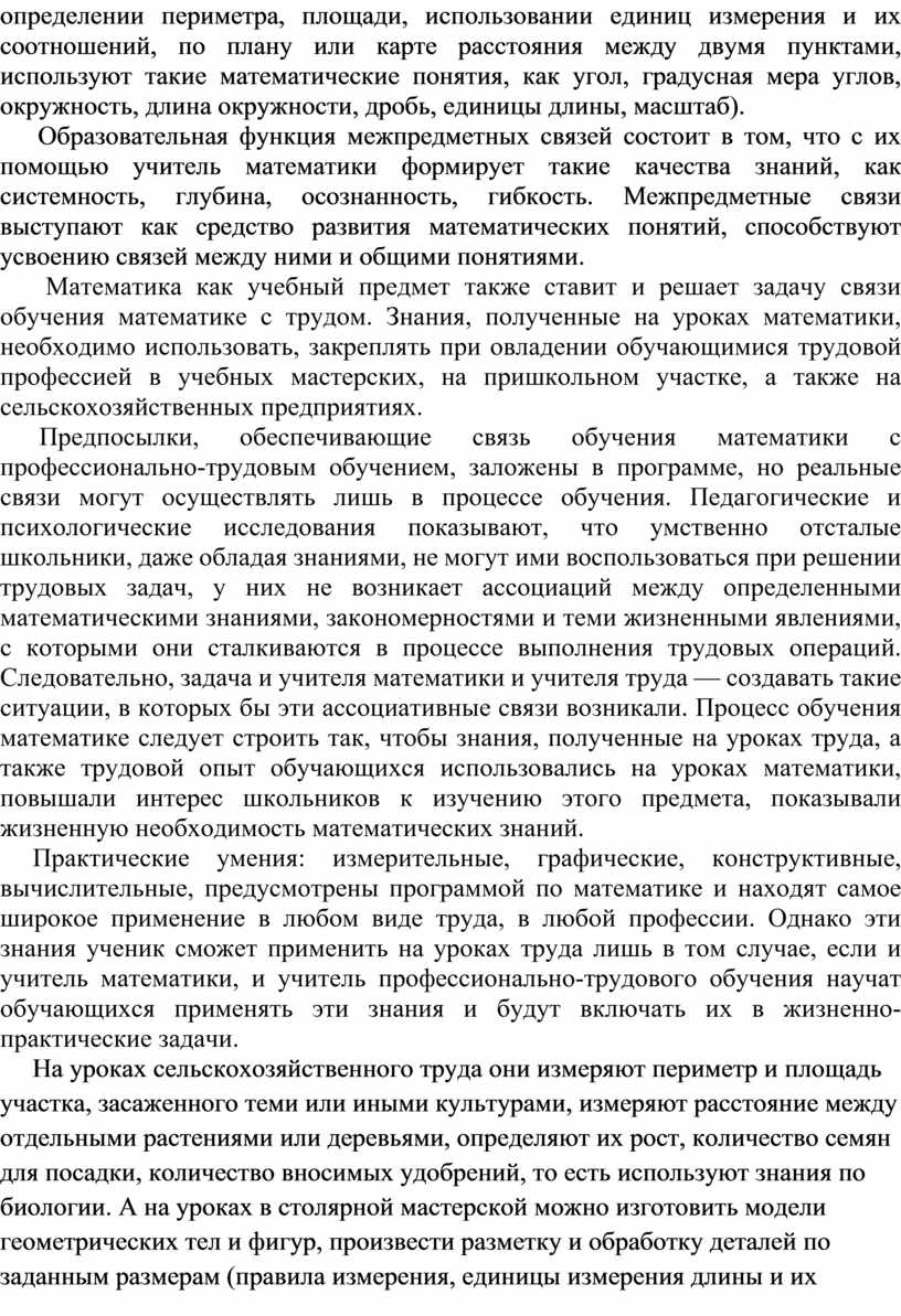 Математика как учебный предмет также ставит и решает задачу связи обучения математике с трудом. Знания, полученные на уроках математики, необходимо использовать, закреплять при овладении обучающимися трудовой профессией в учебных мастерских, на пришкольном участке, а также на сельскохозяйственных предприятиях.