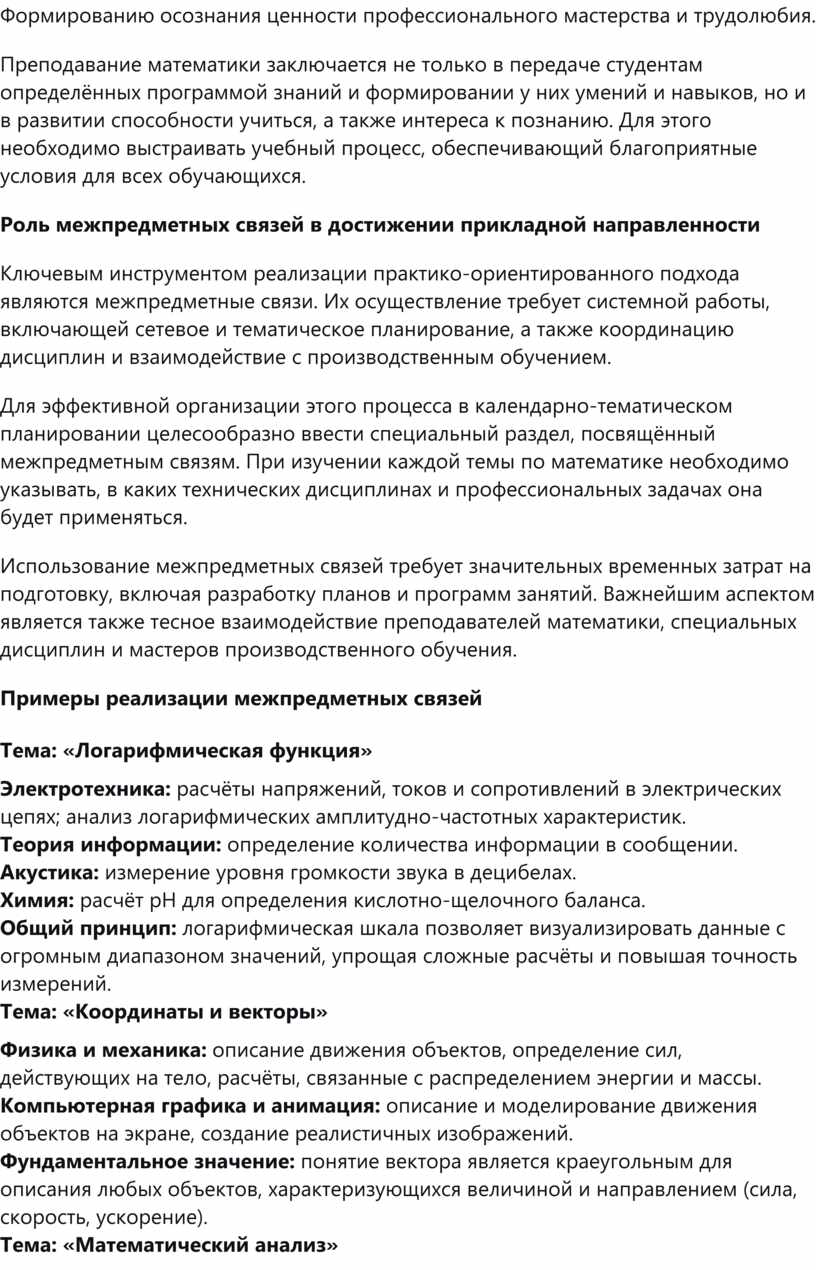 Для эффективной организации этого процесса в календарно-тематическом планировании целесообразно ввести специальный раздел, посвящённый межпредметным связям. При изучении каждой темы по математике необходимо указывать, в каких технических дисциплинах и профессиональных задачах она будет применяться.