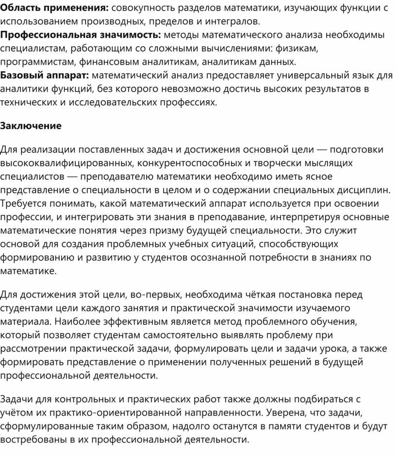 Математика как общеобразовательная дисциплина служит фундаментом для освоения специальных дисциплин. Качественное и глубокое понимание физических, химических, экономических и иных процессов невозможно без прочной математической базы. Развитие мотивации к изучению математики требует демонстрации студенту практической значимости изучаемого материала и необходимости математических знаний для освоения профессиональных модулей.