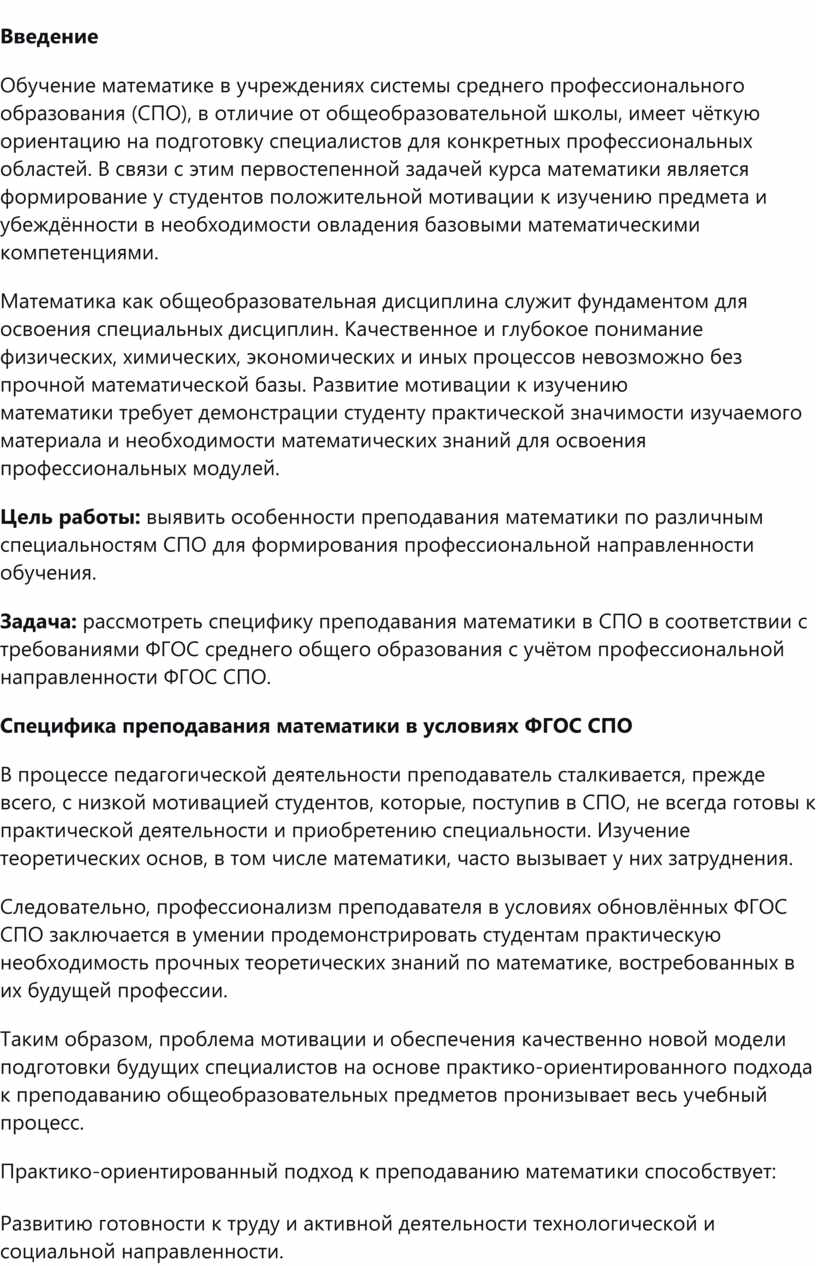Цель работы: выявить особенности преподавания математики по различным специальностям СПО для формирования профессиональной направленности обучения.