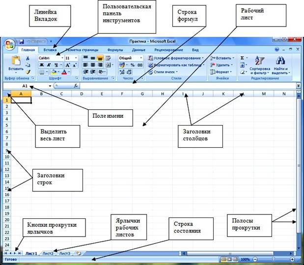 После запуска Excel на экране появляется окно, состоящее из не- скольких элементов (см. рис. 23):