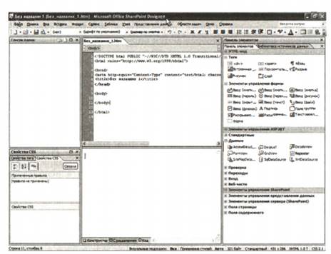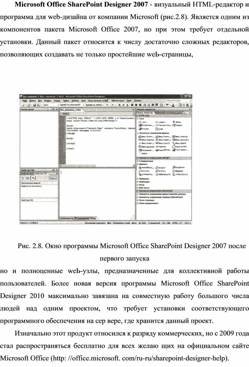 Microsoft Office SharePoint Designer 2007 - визуальный НТМL-редактор и программа для web-дизайна от компании Microsoft (рис.2.8). Является одним из компонентов пакета Microsoft Office 2007, но при этом требует отдельной установки. Данный пакет относится к числу достаточно сложных редакторов, позволяющих создавать не только простейшие wеЬ-страницы,