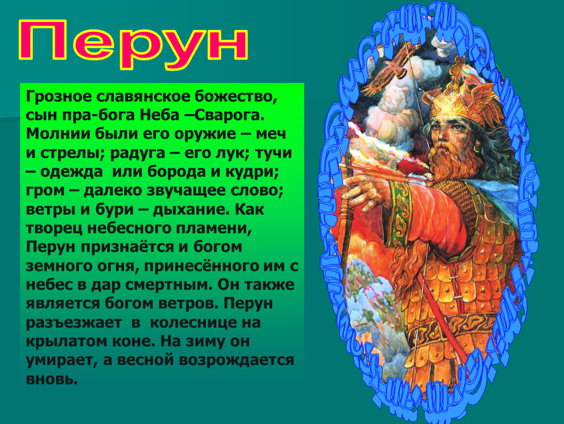 Грозное славянское божество, сын пра-бога Неба –Сварога. Молнии были его оружие – меч и стрелы; радуга – его лук; тучи – одежда или борода и кудри; гром – далеко звучащее слово; ветры и бури – дыхание. Как творец небесного пламени, Перун признаётся и богом земного огня, принесённого им с небес в дар смертным. Он также является богом ветров. Перун разъезжает в колеснице на крылатом коне. На зиму он умирает, а весной возрождается вновь.