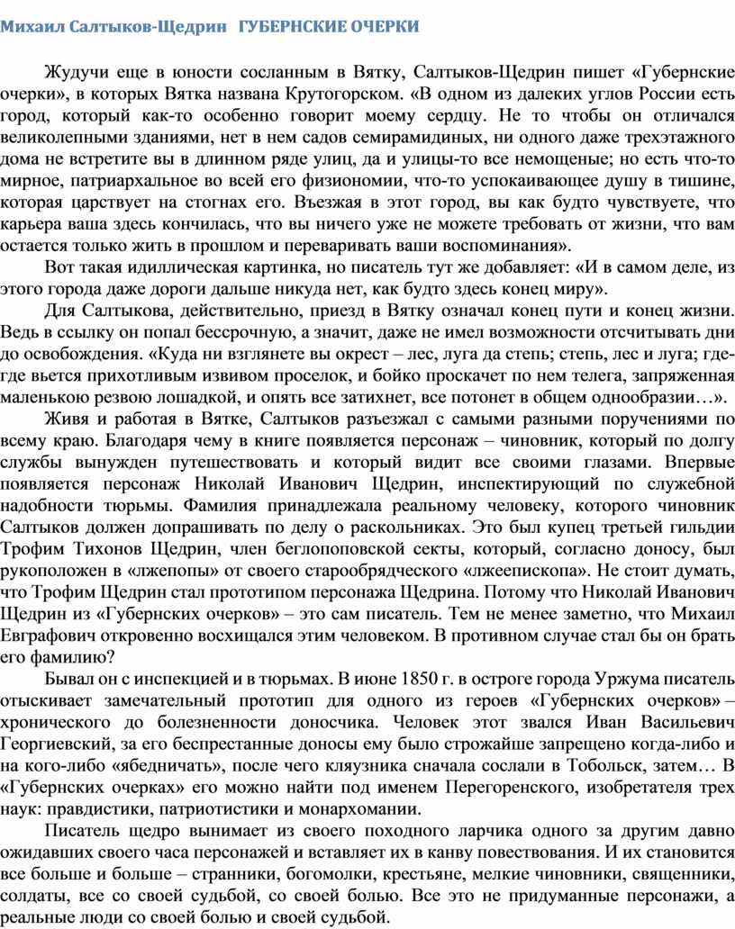 Жудучи еще в юности сосланным в Вятку, Салтыков-Щедрин пишет «Губернские очерки», в которых Вятка названа Крутогорском. «В одном из далеких углов России есть город, который как-то особенно говорит моему сердцу. Не то чтобы он отличался великолепными зданиями, нет в нем садов семирамидиных, ни одного даже трехэтажного дома не встретите вы в длинном ряде улиц, да и улицы-то все немощеные; но есть что-то мирное, патриархальное во всей его физиономии, что-то успокаивающее душу в тишине, которая царствует на стогнах его. Въезжая в этот город, вы как будто чувствуете, что карьера ваша здесь кончилась, что вы ничего уже не можете требовать от жизни, что вам остается только жить в прошлом и переваривать ваши воспоминания».