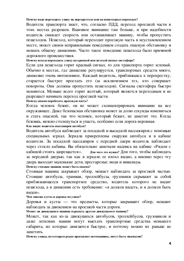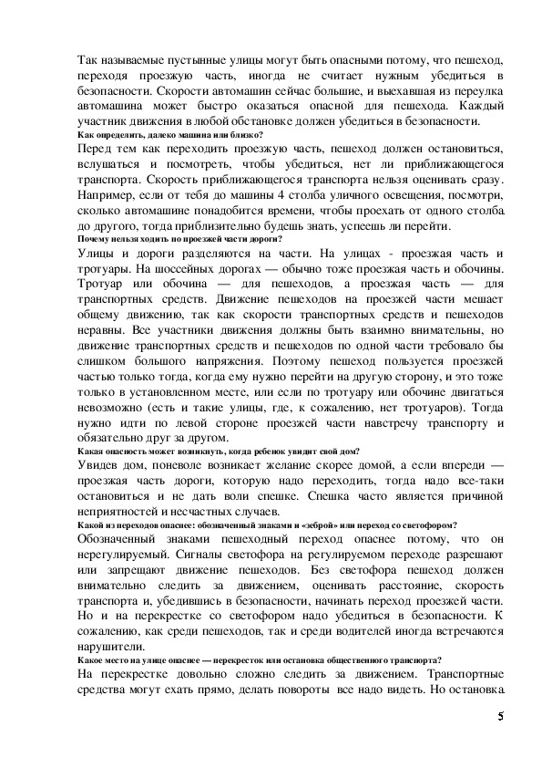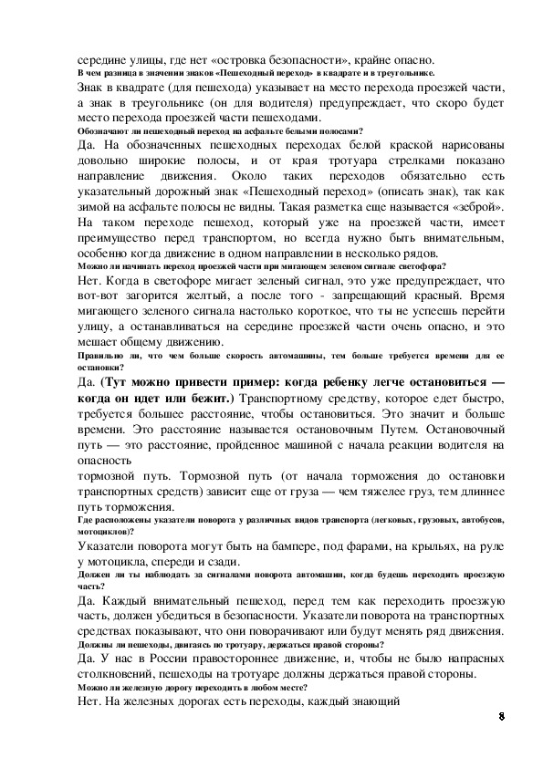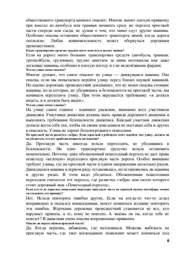 Одной из эффективных форм предупреждения происшествий с детьми на дорогах является проведение специальных "минуток" по безопасности движения. "Минутка" - это краткое временное занятие-напоминание по тематике безопасности движения, которое проводится в конце каждого занятия и родителями (законными представителями) утром, перед выходом из дома. "Минутку" следует проводить, как правило, не реже одного раза в день. Каждый день разбирается новый вопрос из вопросника. После рассмотрения всех вопросов необходимо, используя имеющуюся литературу (или опыт) по безопасности дорожного движения, подготовить новые вопросы. Проведение "Минуток" не должно стать кратковременной компанией, а стать повседневно действующей системой влияния на мышление и действия детей по пути из школы, на воспитание у них навыков правильного поведения в дорожной обстановке.Анализ ДТП с детьми показывает, что они не умеют учитывать особенности окружающей дорожной обстановки. Одной из эффективных форм предупреждения происшествий с детьми на дорогах является проведение специальных "минуток" по безопасности движения. "Минутка" - это краткое временное занятие-напоминание по тематике безопасности движения, которое проводится в конце каждого занятия и родителями (законными представителями) утром, перед выходом из дома. "Минутку" следует проводить, как правило, не реже одного раза в день. Каждый день разбирается новый вопрос из вопросника. После рассмотрения всех вопросов необходимо, используя имеющуюся литературу (или опыт) по безопасности дорожного движения, подготовить новые вопросы. Проведение "Минуток" не должно стать кратковременной компанией, а стать повседневно действующей системой влияния на мышление и действия детей по пути из школы, на воспитание у них навыков правильного поведения в дорожной обстановке.
