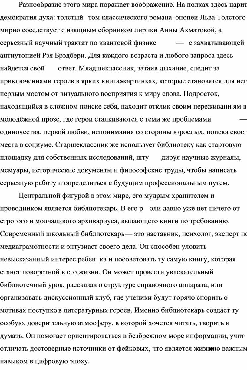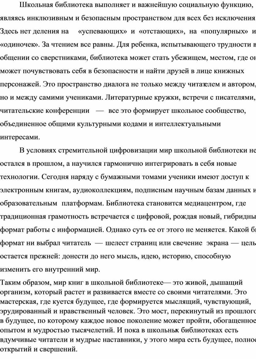 Таким образом, мир книг в школьной библиотеке — это живой, дышащий организм, который растет и развивается вместе со своими читателями. Это мастерская, где куется будущее, где формируется мыслящий, чувствующий, эрудированный и нравственный человек. Это мост, перекинутый из прошлого в будущее, по которому каждое новое поколение может пройти, обогащенное опытом и мудростью тысячелетий. И пока в школьных библиотеках есть вдумчивые читатели и мудрые наставники, у этого мира есть будущее, полное открытий и свершений.
