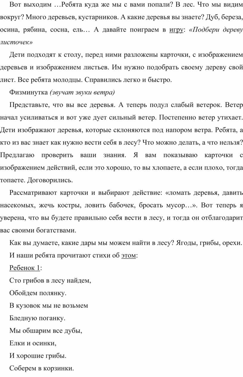 Представьте, что вы все деревья. А теперь подул слабый ветерок. Ветер начал усиливаться и вот уже дует сильный ветер. Постепенно ветер утихает. Дети изображают деревья, которые склоняются под напором ветра. Ребята, а кто из вас знает как нужно вести себя в лесу? Что можно делать, а что нельзя? Предлагаю проверить ваши знания. Я вам показываю карточки с изображением действий, если это хорошо, то вы хлопаете, а если плохо, тогда топаете. Договорились.