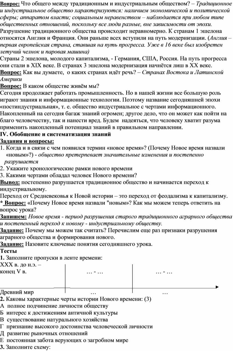 Вопрос: Что общего между традиционным и индустриальным обществом? – Традиционное и индустриальное общество характеризуются: наличием экономической и политической сферы; аппаратом власти; социальным неравенством – наблюдается при любом типе общественных отношений, поскольку все люди разные, вне зависимости от эпохи.