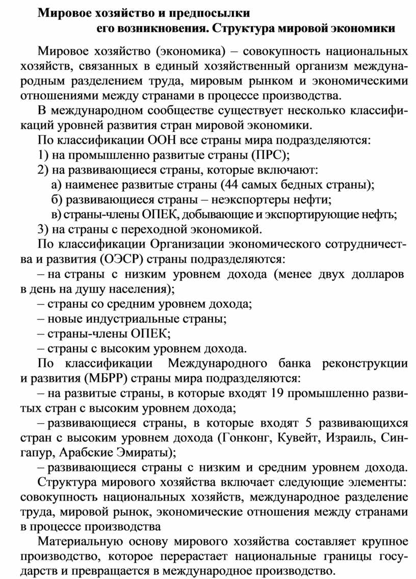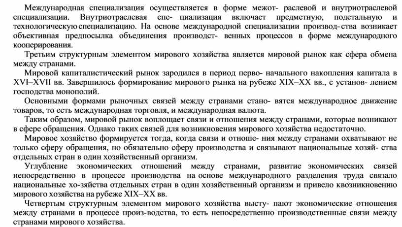Углубление экономических отношений между странами, развитие экономических связей непосредственно в процессе производства на основе международного разделения труда связало национальные хо- зяйства отдельных стран в один хозяйственный организм и привело к возникновению мирового хозяйства на рубеже XIX–XX вв.