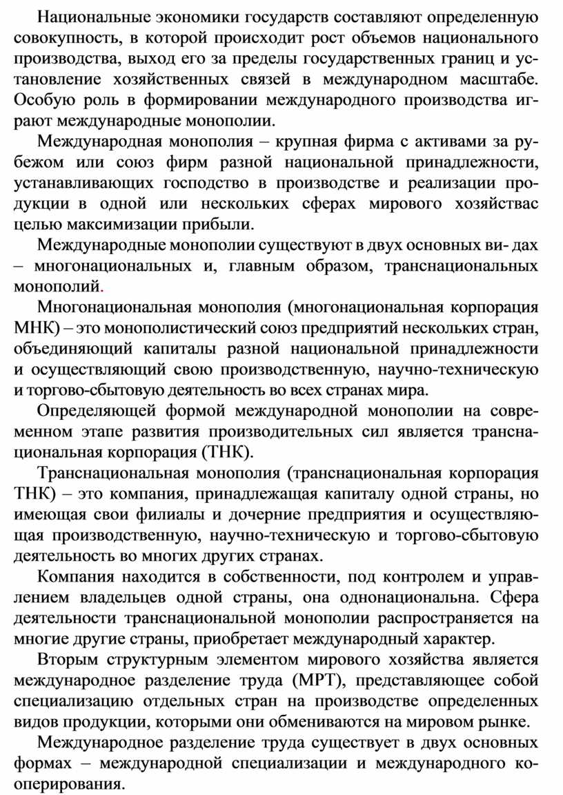 Национальные экономики государств составляют определенную совокупность, в которой происходит рост объемов национального производства, выход его за пределы государственных границ и ус- тановление хозяйственных связей в международном масштабе. Особую роль в формировании международного производства иг- рают международные монополии.