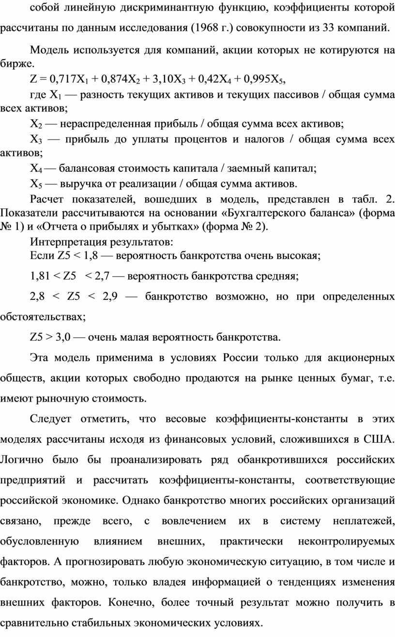 Z2 = а + р х коэффициент текущей ликвидности + ух удельный вес заемных средств в активах (в долях единицы),