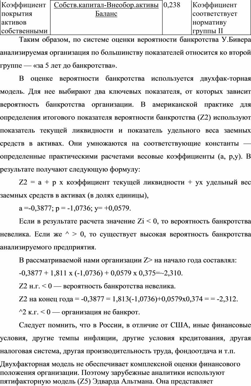 Таким образом, по системе оценки вероятности банкротства У.Бивера анализируемая организация по большинству показателей относится ко второй группе — «за 5 лет до банкротства».