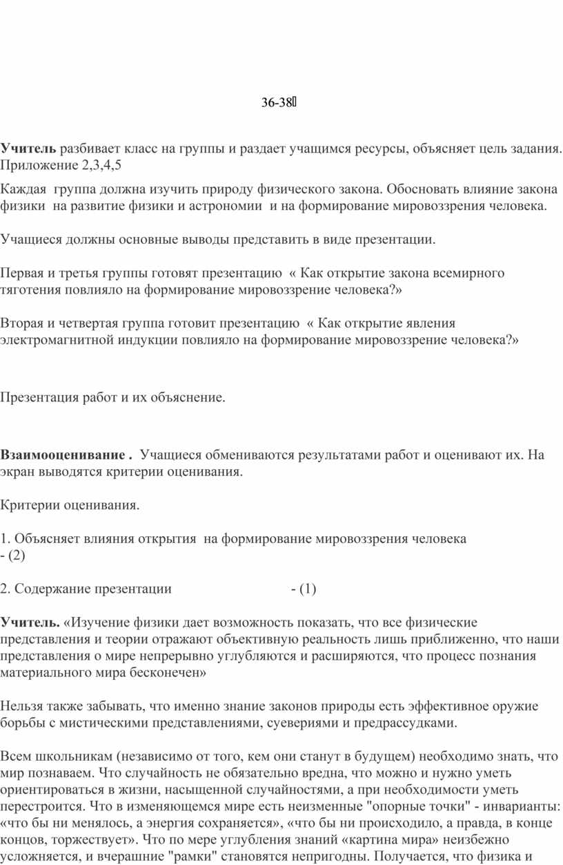 Взаимооценивание . Учащиеся обмениваются результатами работ и оценивают их. На экран выводятся критерии оценивания. Критерии оценивания. 1. Объясняет влияния открытия на формирование мировоззрения человека - (2) 2. Содержание презентации - (1) Учитель. «Изучение физики дает возможность показать, что все физические представления и теории отражают объективную реальность лишь приближенно, что наши представления о мире непрерывно углубляются и расширяются, что процесс познания материального мира бесконечен» Нельзя также забывать, что именно знание законов природы есть эффективное оружие борьбы с мистическими представлениями, суевериями и предрассудками. Всем школьникам (независимо от того, кем они станут в будущем) необходимо знать, что мир познаваем. Что случайность не обязательно вредна, что можно и нужно уметь ориентироваться в жизни, насыщенной случайностями, а при необходимости уметь перестроится. Что в изменяющемся мире есть неизменные "опорные точки" - инварианты: «что бы ни менялось, а энергия сохраняется», «что бы ни происходило, а правда, в конце концов, торжествует». Что по мере углубления знаний «картина мира» неизбежно усложняется, и вчерашние "рамки" становятся непригодны. Получается, что физика и астрономия оказывает огромное влияние на формирование активной жизненной позиции молодежи.