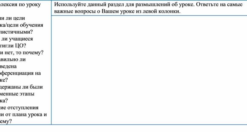 Используйте данный раздел для размышлений об уроке. Ответьте на самые важные вопросы о Вашем уроке из левой колонки. |