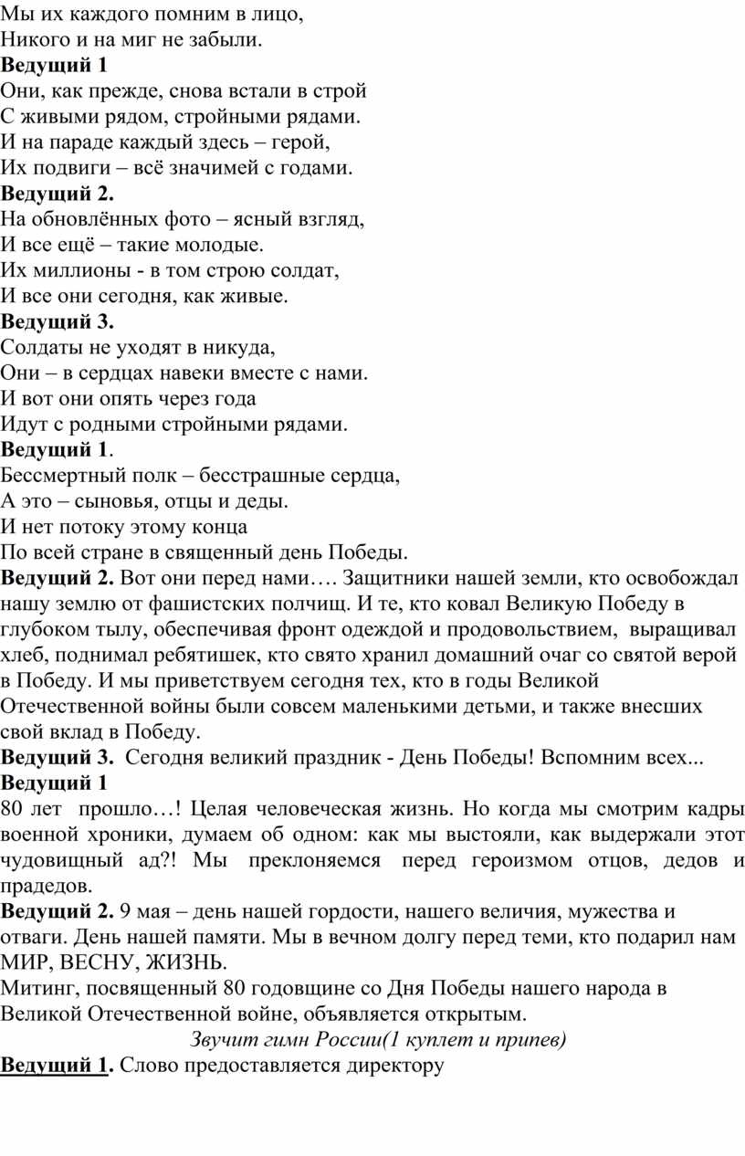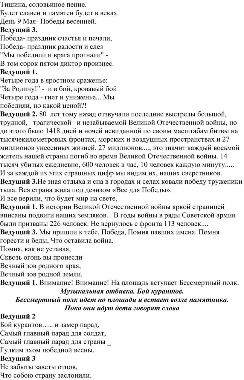 Ведущий 3. Мы пришли к тебе, Победа, Помня павших имена. Помня горести и беды, Что оставила война.