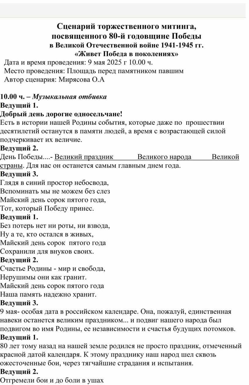 Митинг, посвященный 80 годовщине со Дня Победы нашего народа в Великой Отечественной войне, объявляется открытым.