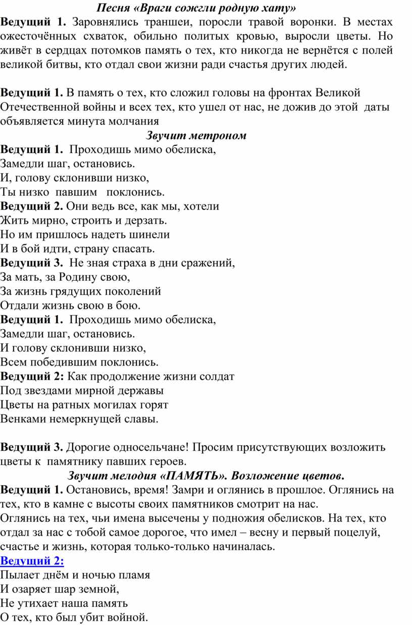Ведущий 1. В память о тех, кто сложил головы на фронтах Великой Отечественной войны и всех тех, кто ушел от нас, не дожив до этой даты объявляется минута молчания