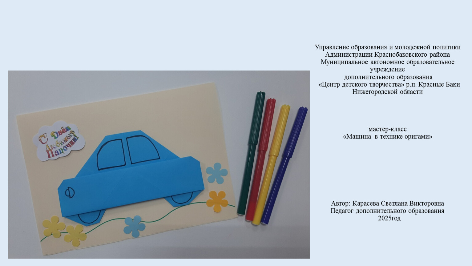 Управление образования и молодежной политики Администрации Краснобаковского районаМуниципальное автономное образовательное учреждение дополнительного образования «Центр детского творчества» р.п. Красные Баки Нижегородской областимастер-класс «Машина в технике оригами»Автор: Карасева Светлана ВикторовнаПедагог дополнительного образования 2025год