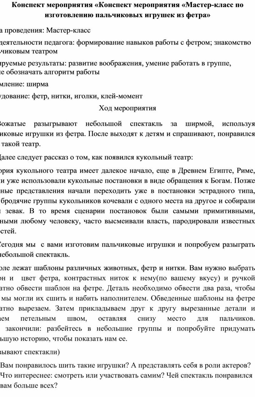 Конспект мероприятия «Конспект мероприятия «Мастер-класс по изготовлению пальчиковых игрушек из фетра»