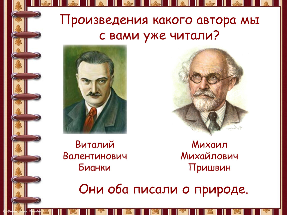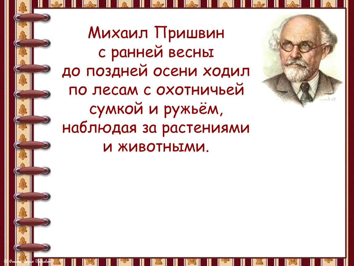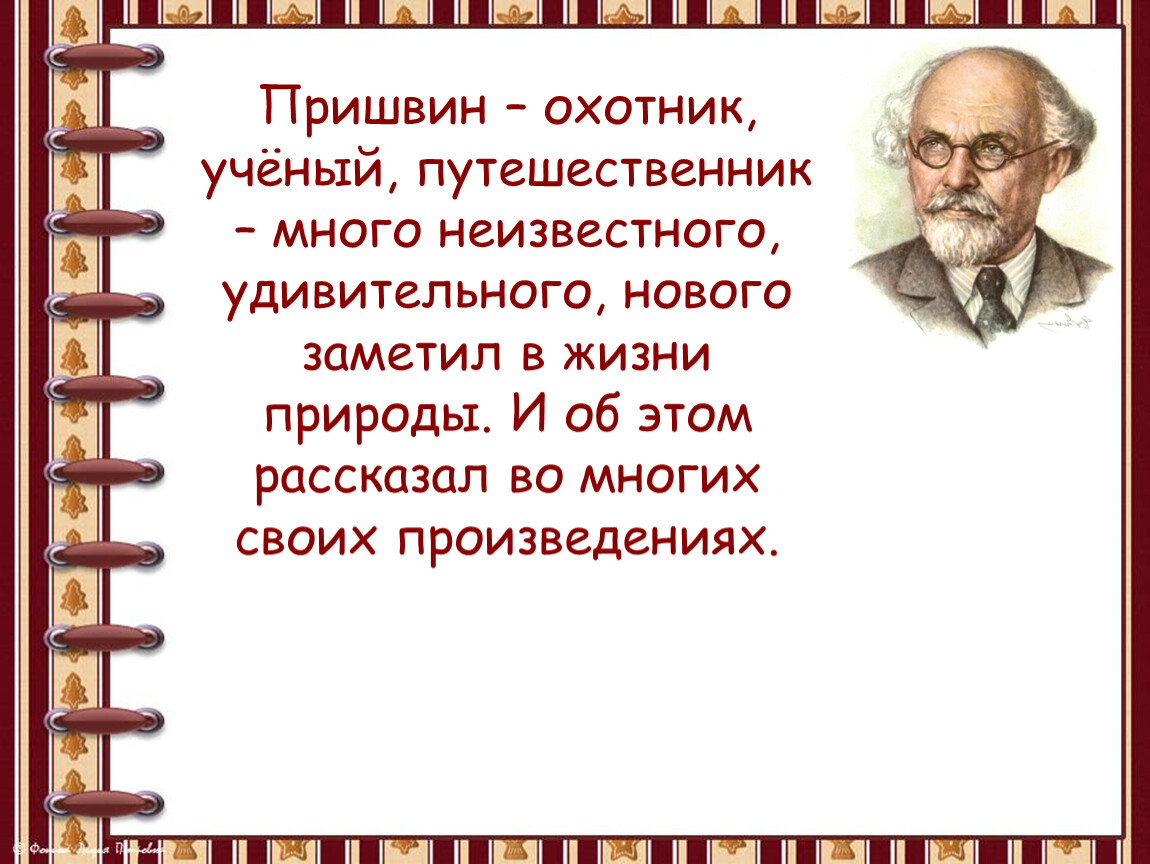 Пришвин – охотник, учёный, путешественник – много неизвестного, удивительного, нового заметил в жизни природы. И об этом рассказал во многих своих произведениях.