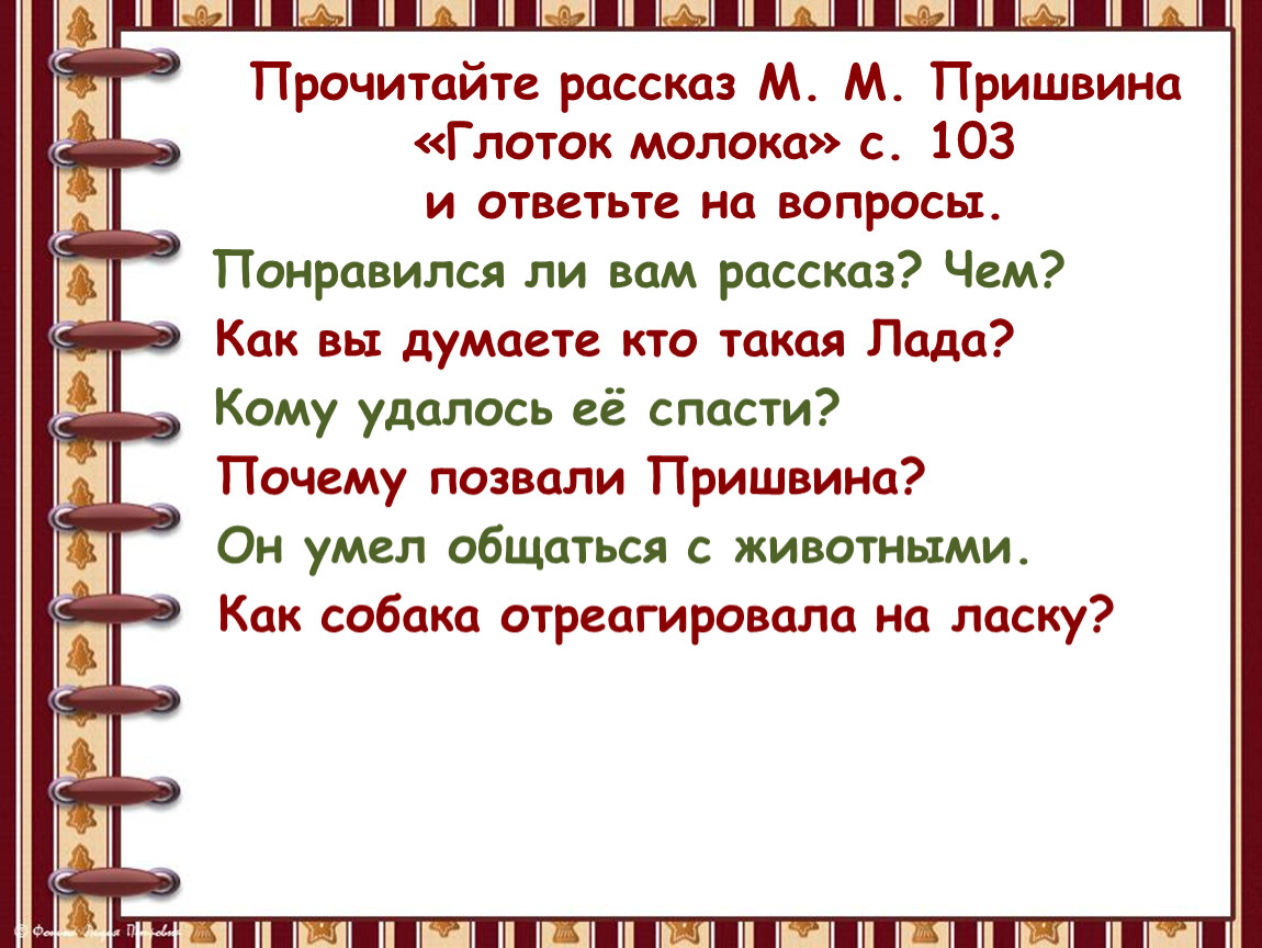 Прочитайте рассказ М. М. Пришвина «Глоток молока» с. 103