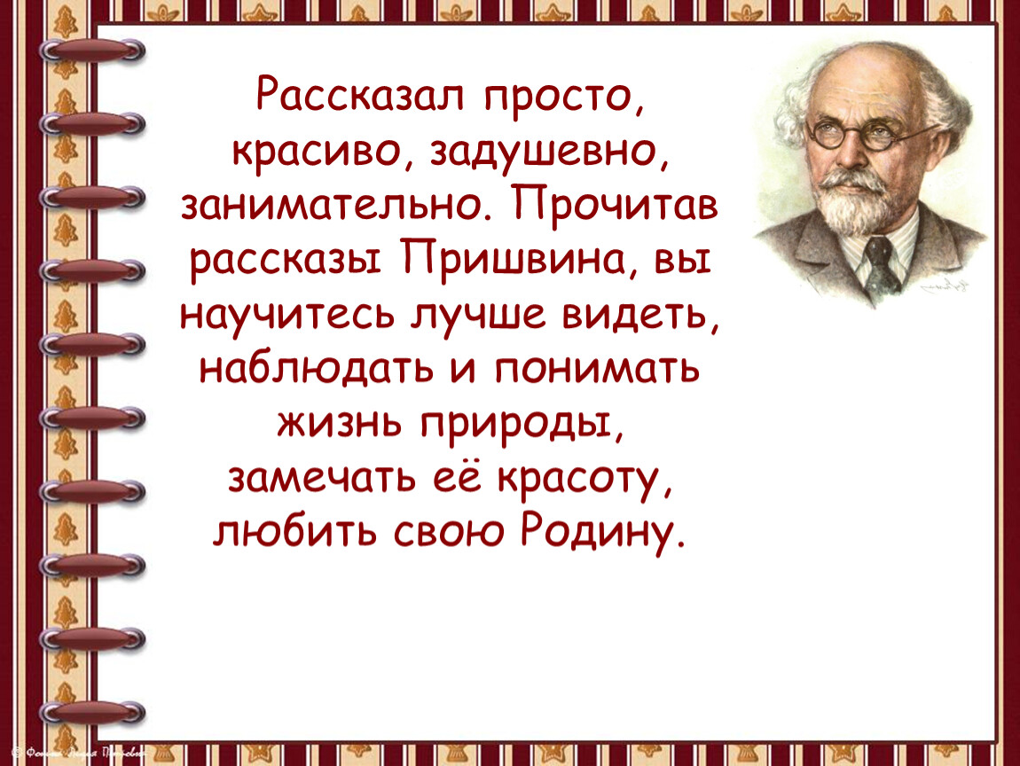 Рассказал просто, красиво, задушевно, занимательно. Прочитав рассказы Пришвина, вы научитесь лучше видеть, наблюдать и понимать жизнь природы, замечать её красоту, любить свою Родину.