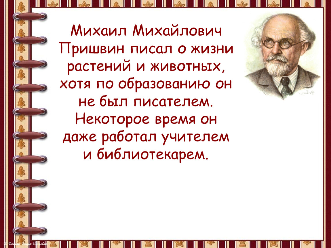 Михаил Михайлович Пришвин писал о жизни растений и животных, хотя по образованию он не был писателем. Некоторое время он даже работал учителем и библиотекарем.