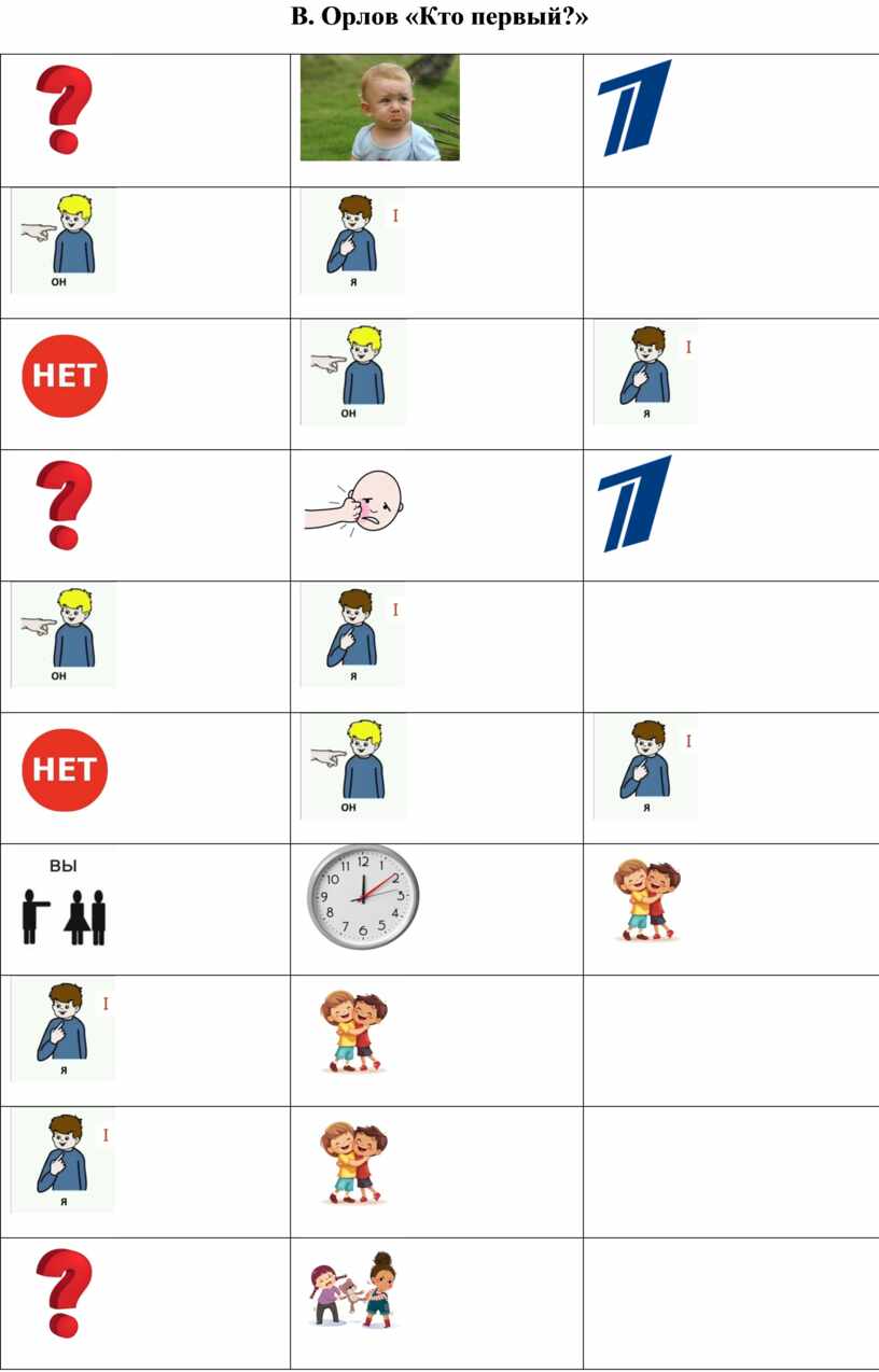 Мнемотаблица для облегчения заучивания стихотворения В. Орлова "Кто первый?"