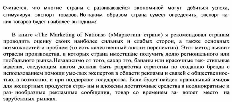 В книге «The Marketing of Nations» («Маркетинг стран») я рекомендовал странам проводить оценку своих наиболее сильных и слабых сторон, а также основных возможностей и проблем (то есть качественный анализ перспектив). Этот метод выявит отрасли производства, в которых страна имеет шанс получить долю регионального или глобального рынка. Независимо от того, сахар это, бананы или красочные тек стильные изделия, следующим шагом должна быть разработка стратегии по созданию бренда с использованием помощи уме лых экспертов в области рекламы и связей с общественнос тью, а возможно, и при поддержке государства. Если будет найден правильный имидж для экспортных продуктов стра ны и вложены достаточные средства в неоднократные и раз нообразные рекламные сообщения, товар со временем за воюет место на зарубежных рынках.