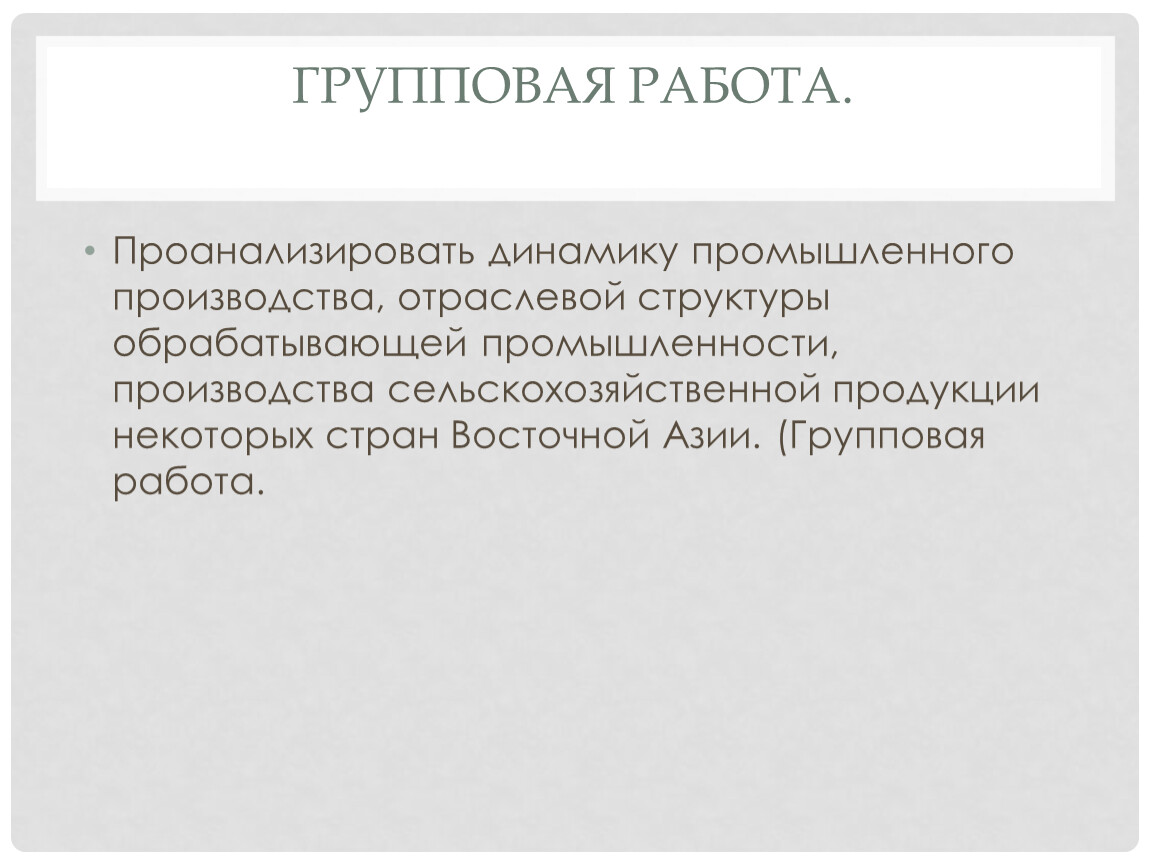 Проанализировать динамику промышленного производства, отраслевой структуры обрабатывающей промышленности, производства сельскохозяйственной продукции некоторых стран Восточной Азии. (Групповая работа.