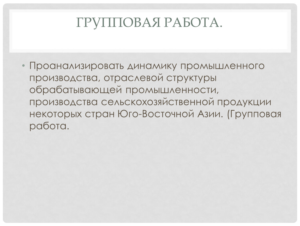 Проанализировать динамику промышленного производства, отраслевой структуры обрабатывающей промышленности, производства сельскохозяйственной продукции некоторых стран Юго-Восточной Азии. (Групповая работа.