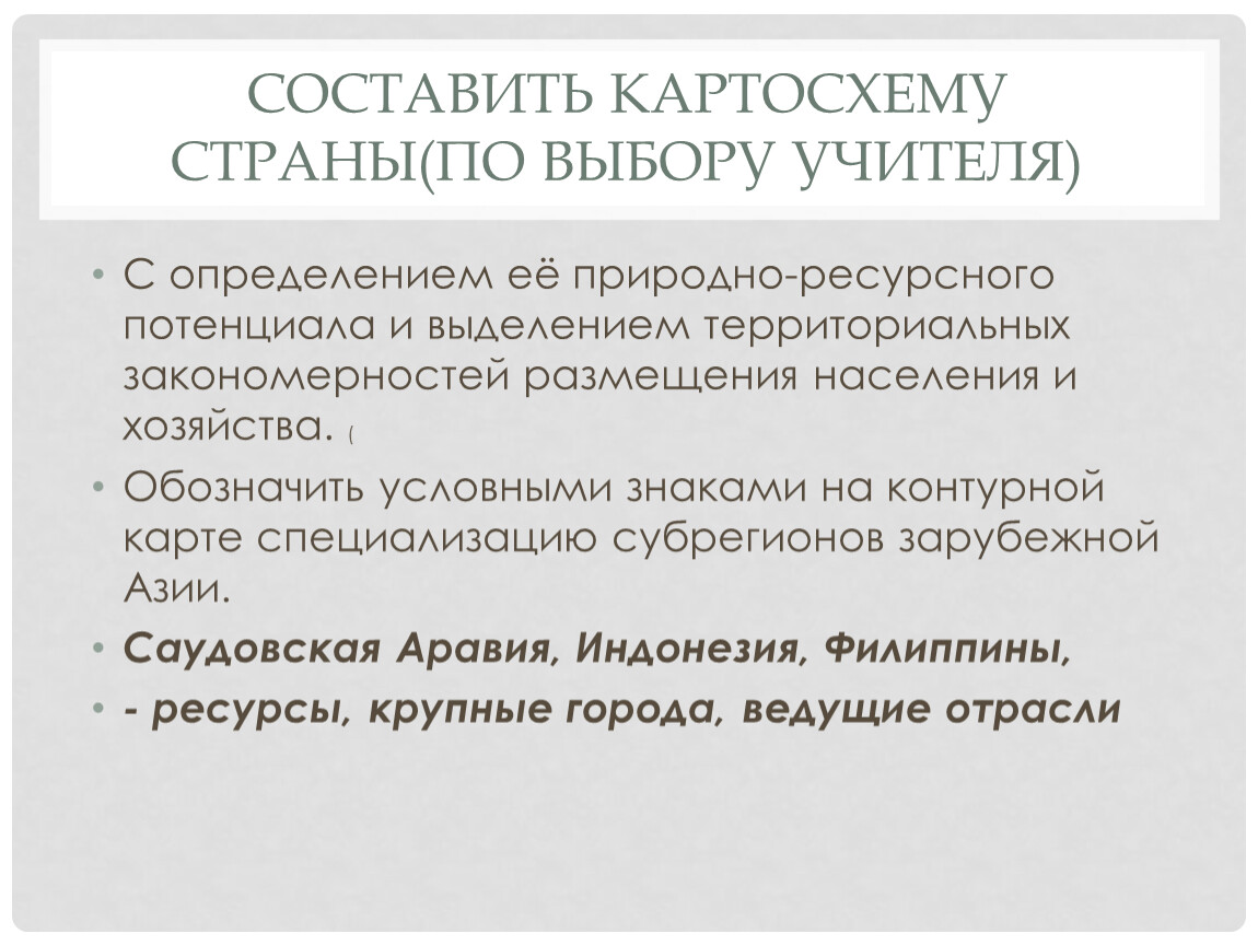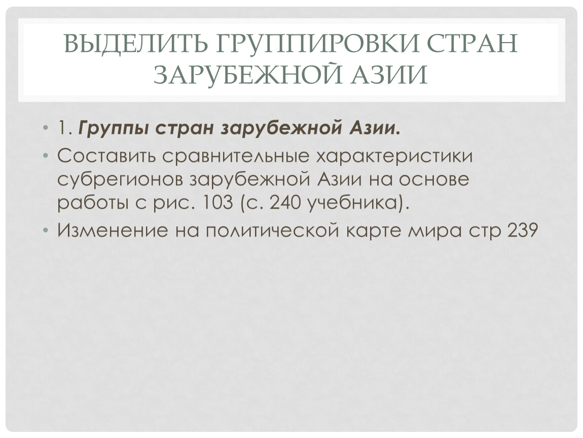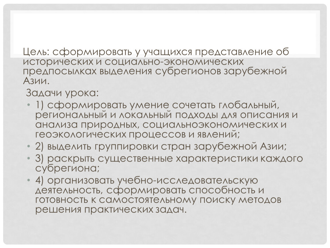 Цель: сформировать у учащихся представление об исторических и социально-экономических предпосылках выделения субрегионов зарубежной Азии.
