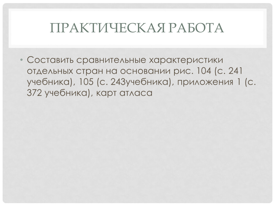 Составить сравнительные характеристики отдельных стран на основании рис. 104 (с. 241 учебника), 105 (с. 243учебника), приложения 1 (с. 372 учебника), карт атласа