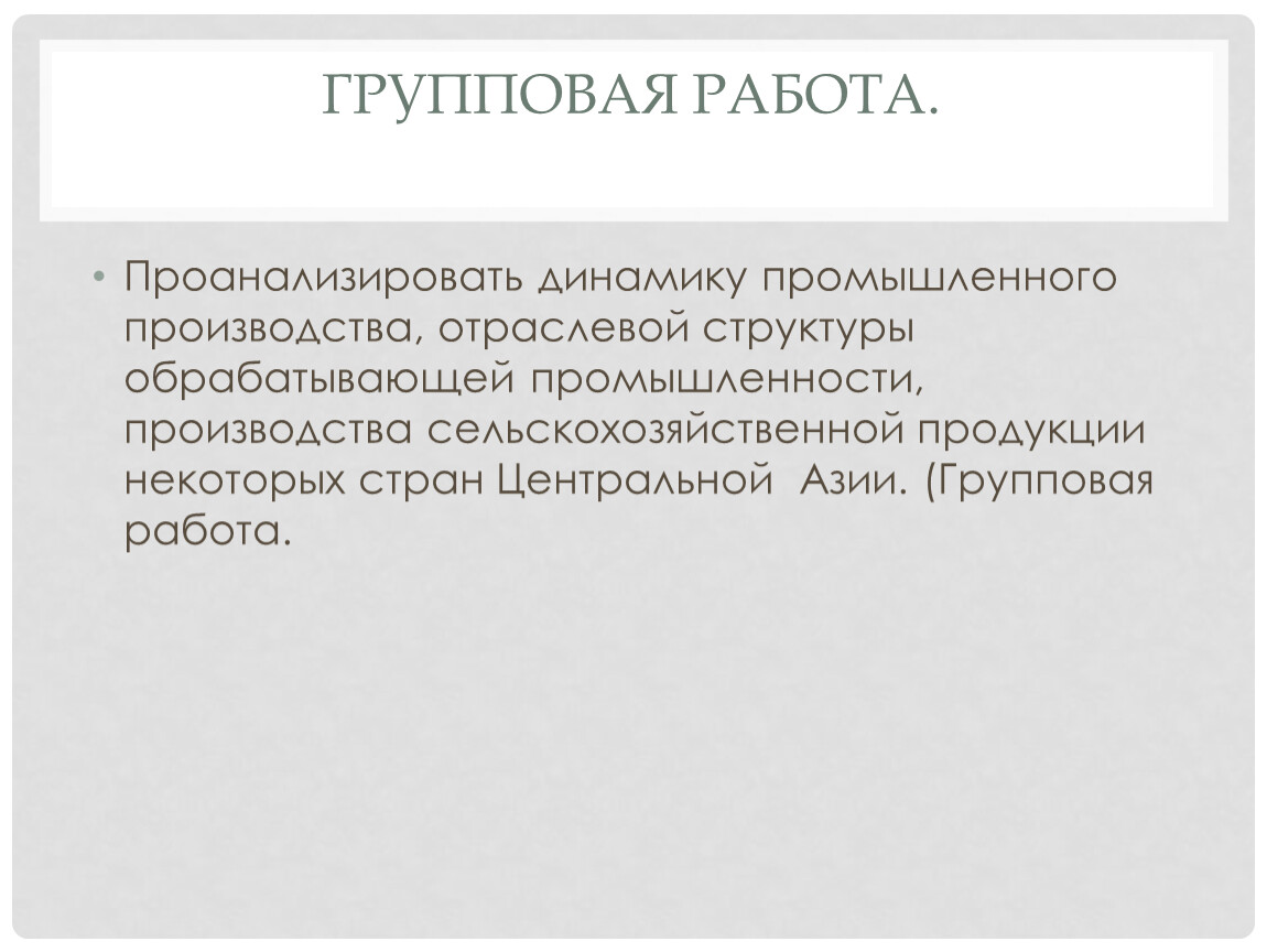 Проанализировать динамику промышленного производства, отраслевой структуры обрабатывающей промышленности, производства сельскохозяйственной продукции некоторых стран Юго-Западной Азии. (Групповая работа.
