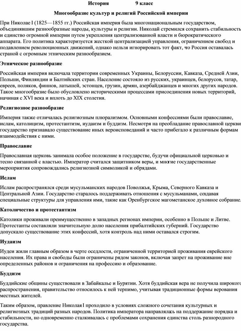 Таким образом, правление Николая I проходило в условиях сложного сочетания культурных и религиозных традиций разных народов. Политика императора направлялась на поддержание порядка и стабильности, но одновременно сталкивалась с проблемами сохранения единства столь разнородного государства.