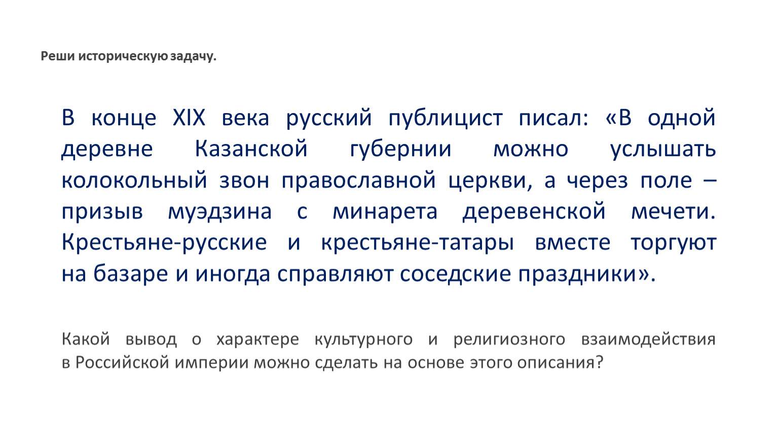 В конце XIX века русский публицист писал: «В одной деревне Казанской губернии можно услышать колокольный звон православной церкви, а через поле – призыв муэдзина с минарета деревенской мечети. Крестьяне-русские и крестьяне-татары вместе торгуют на базаре и иногда справляют соседские праздники».