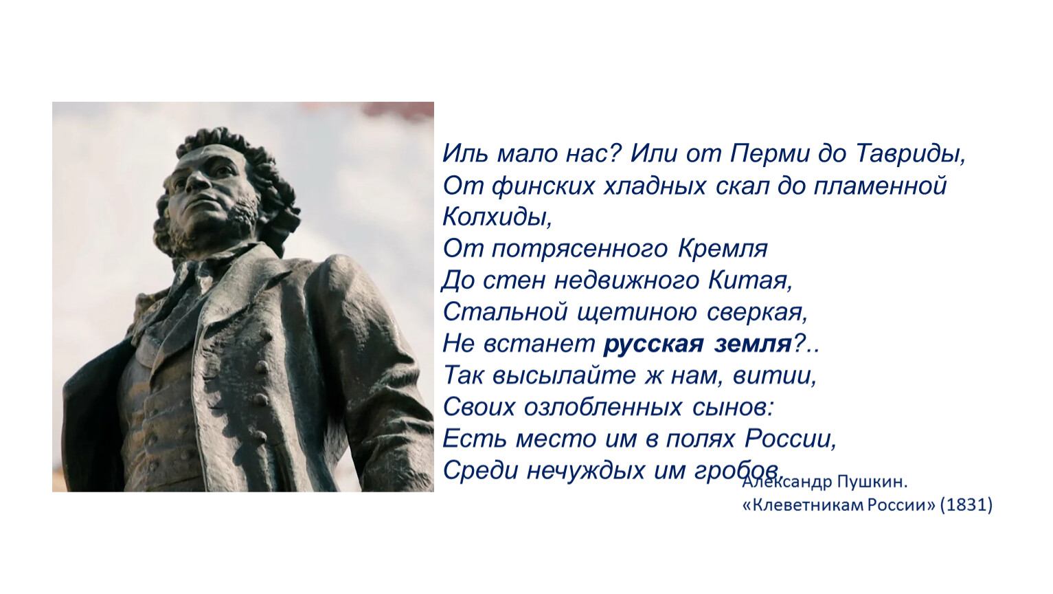 Иль мало нас? Или от Перми до Тавриды,От финских хладных скал до пламенной Колхиды,От потрясенного КремляДо стен недвижного Китая,Стальной щетиною сверкая,Не встанет русская земля?..Так высылайте ж нам, витии,Своих озлобленных сынов:Есть место им в полях России,Среди нечуждых им гробов.