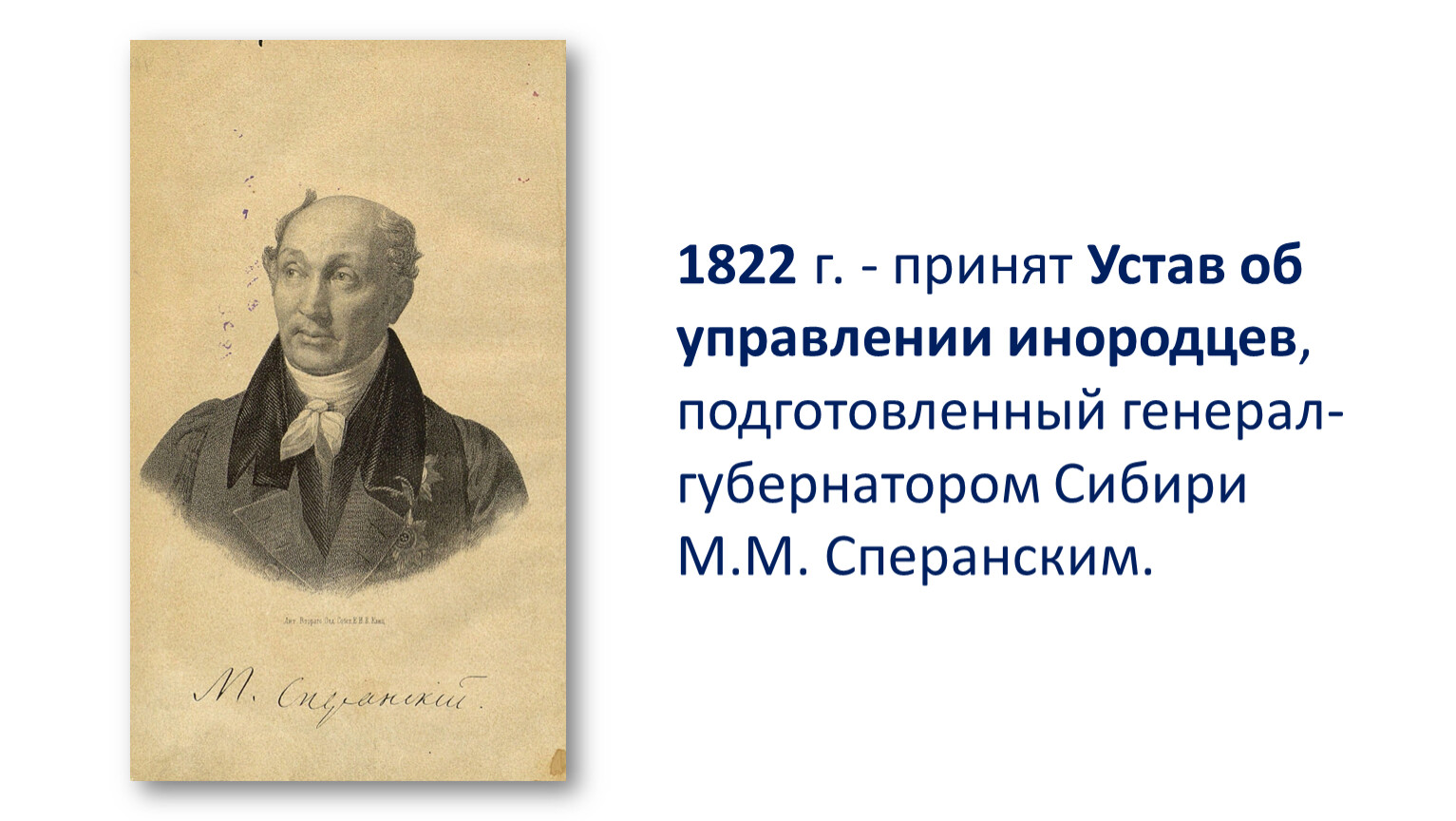 1822 г. - принят Устав об управлении инородцев, подготовленный генерал-губернатором Сибири М.М. Сперанским.