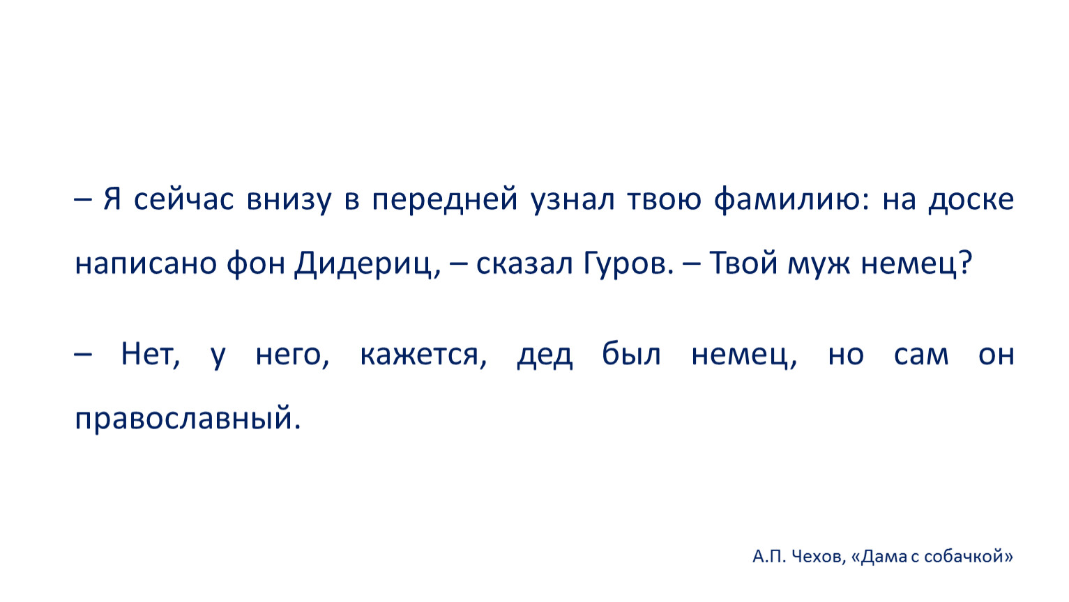 – Я сейчас внизу в передней узнал твою фамилию: на доске написано фон Дидериц, – сказал Гуров. – Твой муж немец?