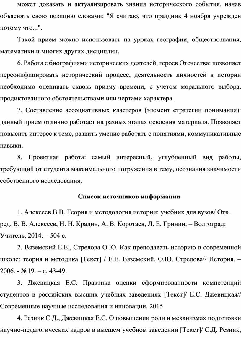 2. Vyazemsky E.E., Strelova O.Y. How to teach history in a modern school: theory and methodology [Text] / E.E. Vyazemsky, O.Y. Strelova// History. 2006. No. 19. pp. 43-49. 3. Dzhevitskaya E.S. The practice of assessing the formation of students' competencies in Russian higher educational institutions [Text]/ E.S. Dzhevitskaya// Modern scientific research and innovation. 2015